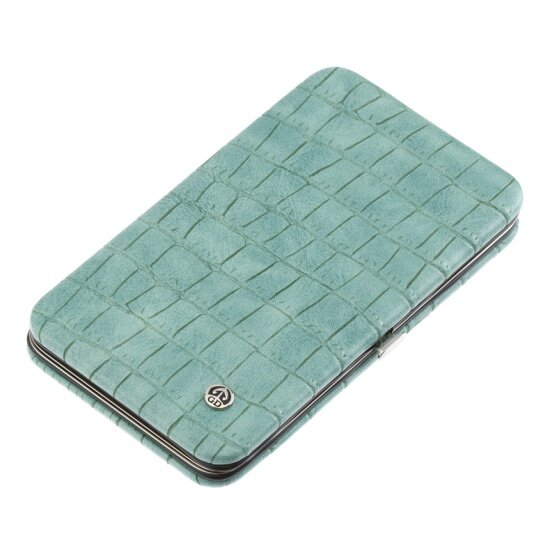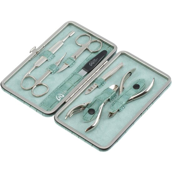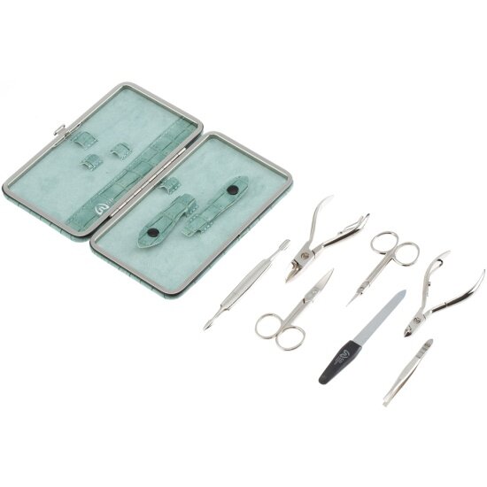 Маникюрный набор GD, 7 пр. Инструменты: ножницы для кутикулы, ножницы для ногтей, кусачки для кутикулы, кусачки для ногтей, пилка металлическая 12,5 см, пинцет скошенный, двойной маникюрный инструмент. Футляр: искусственная кожа, цвет зеленый, фактура - крокодил