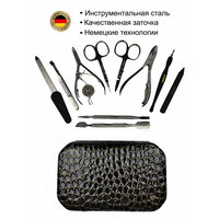 Маникюрный набор Zinger (10 предметов), футляр из натуральной кожи с защелкой-автомат. Внутренняя отделка футляра - мягкий велюр, имитация замши, цвет в тон коже футляра. В состав набора входят: ножницы для ногтей, ножницы для кутикулы, кусачки маникюрные, кусачки педикюрные, 2 шабера, металлическая пилочка, пинцет, триммер и маникюрная палочка.