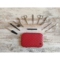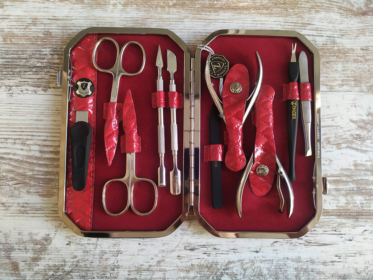 Маникюрный набор Zinger (10 предметов), футляр из натуральной кожи с защелкой-автомат. Внутренняя отделка футляра - мягкий велюр, имитация замши, цвет в тон коже футляра. В состав набора входят: ножницы для ногтей, ножницы для кутикулы, кусачки маникюрные, кусачки педикюрные, 2 шабера, металлическая пилочка, пинцет, триммер и маникюрная палочка.