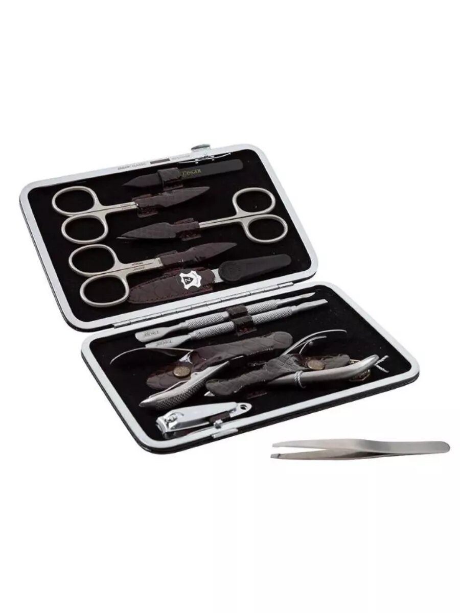 Zinger Набор для маникюра и педикюра, 10 предметов ze-MSFE-804-3(820). Маникюрный набор с клиппером. Качественная сталь, профессиональная ручная заточка. Упакован в подарочную коробку с логотипом.