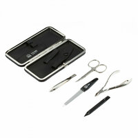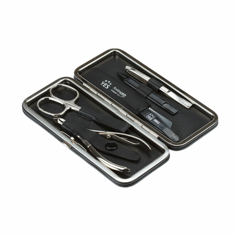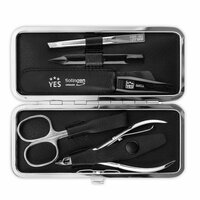 Бренд -YES Гарантия -6 месяцев Цвет -Черный Пилка- Да Вид застежки- Замок Количество элементов в наборе -5 Кусачки для кутикулы -Да Материал чехла -Натуральная кожа вола Материал элементов -Углеродистая сталь Ножницы -Да Ножницы для кутикулы- Да Пинцет наклонный -Да Покрытие элементов -Никель Шабер двухсторонний- Да