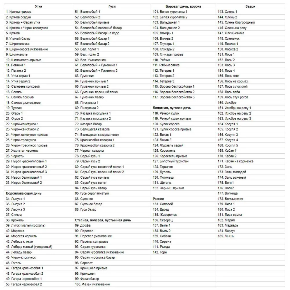 - Большая память на 185 голос зверей и птиц, которые для большего удобства распределены по 9-ти соответствующим папкам: избранное, утки, гуси, водоплавающая дичь, боровая дичь, ворона степная, полевая дичь, болотная и луговая дичь, звери, разное.