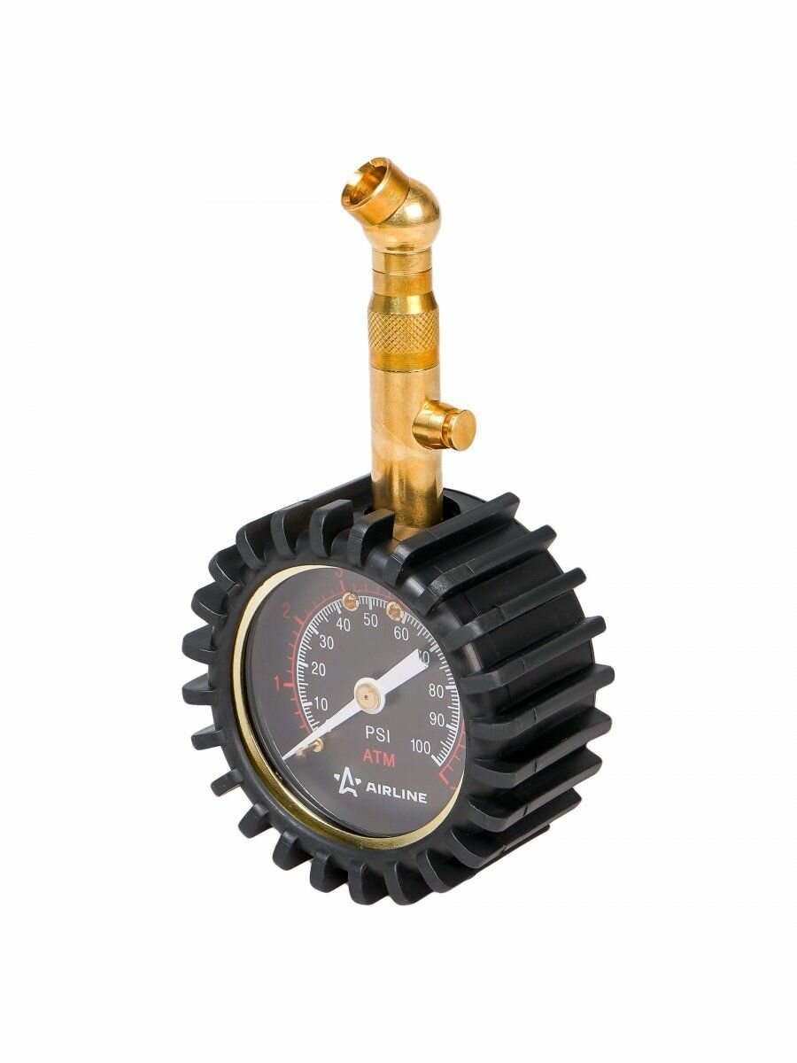 Манометр для автомобиля стрелочный, профессиональный AEAS002 AIRLINE AEAS002, высокопрочный металлический корпус с защитным резиновым покрытием,-это устройство для измерения давления воздуха в шинах автомобиля. На корпусе присутствует специальный выступ для сброса лишнего давления в шине.