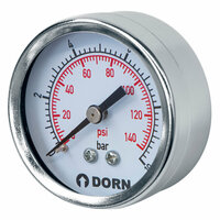 Манометр аксиального типа DORN (Дорн) DPG-1 отображает величину давления воды в системе или непосредственно на выходе из водяного насоса. Модель измеряет давление в пределах от 0 до 10 бар. Наружная резьба: 1/4.
