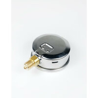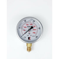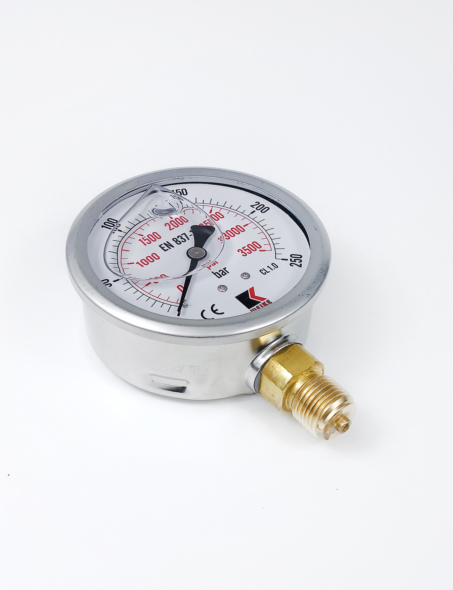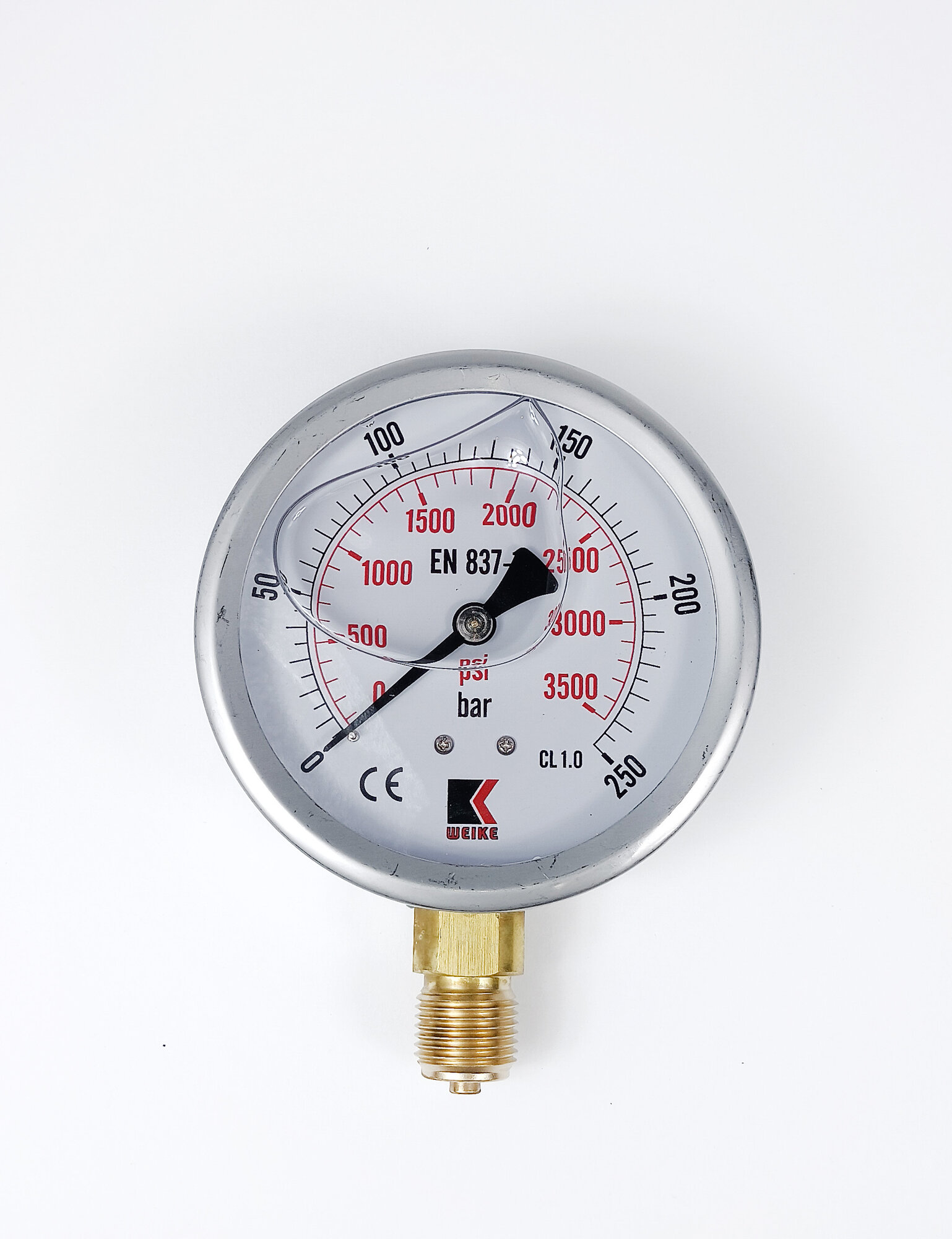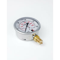 Манометр гидравлический WKP1007 деформационный с трубчатой пружиной, заполненный глицерином. Его тип радиальный – выход штуцера расположен перпендикулярно центральной оси манометра. Рассчитан на максимальное давление 250 бар и имеет номинальный диаметр 100 мм с резьбой штуцера G 1/2". У представленного манометра 2 шкалы измерения в Бар (bar / черная шкала) и Пси (psi / красная шкала).