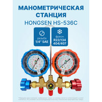 Манометрическая станция HONGSEN HS-536C (R22/134/404/407), 2-х вентильная; шланги 0.9м-1/4″SAE до 41 Bar; манометры 68мм, латунный корпус со смотровым стеклом)