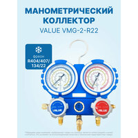 Манометрический коллектор VALUE VMG-2-R22 Серия манометрических коллекторов VMG отличается высокой надежностью и качеством используемых материалов. Корпус манометров выполнен из алюминиевого сплава и покрыт резиной для защиты от повреждений. Металлические вставки в вентилях позволяет увеличить срок их службы. Преимущества манометрических коллекторов Value большой диаметр циферблата корпус из литого алюминия возможность калибровки высокая точность измерения шланги из высококачественной резины.