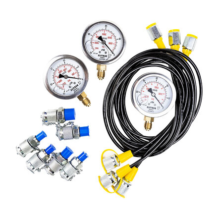 Профессиональный набор глицериновых манометров для измерения давления в гидросистемах спецтехники - экскаваторов, бульдозеров, кранов, а также в промышленном оборудовании, имеющем гидравлическую систему.