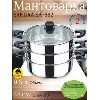 Купить Мантоварка 2 яруса 9,5 литра 24см диаметр нержавеющая сталь, крышка из термостойкого стекла Сакура SA-662 (OL) с доставкой по всей России.