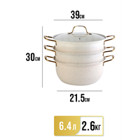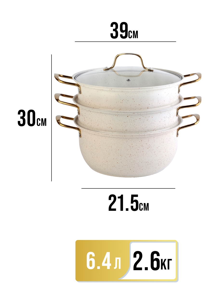 Набор 4 предмета: кастрюля, 2 съемных яруса, крышка. Диаметр: 30 см (6,4 л). Диаметр дна: 21,5 см. Высота кастрюли без крышки: 12,5 см. Высота секции: 6 см. Высота в собранном виде: 30 см. Длина с ручками: 39 см.