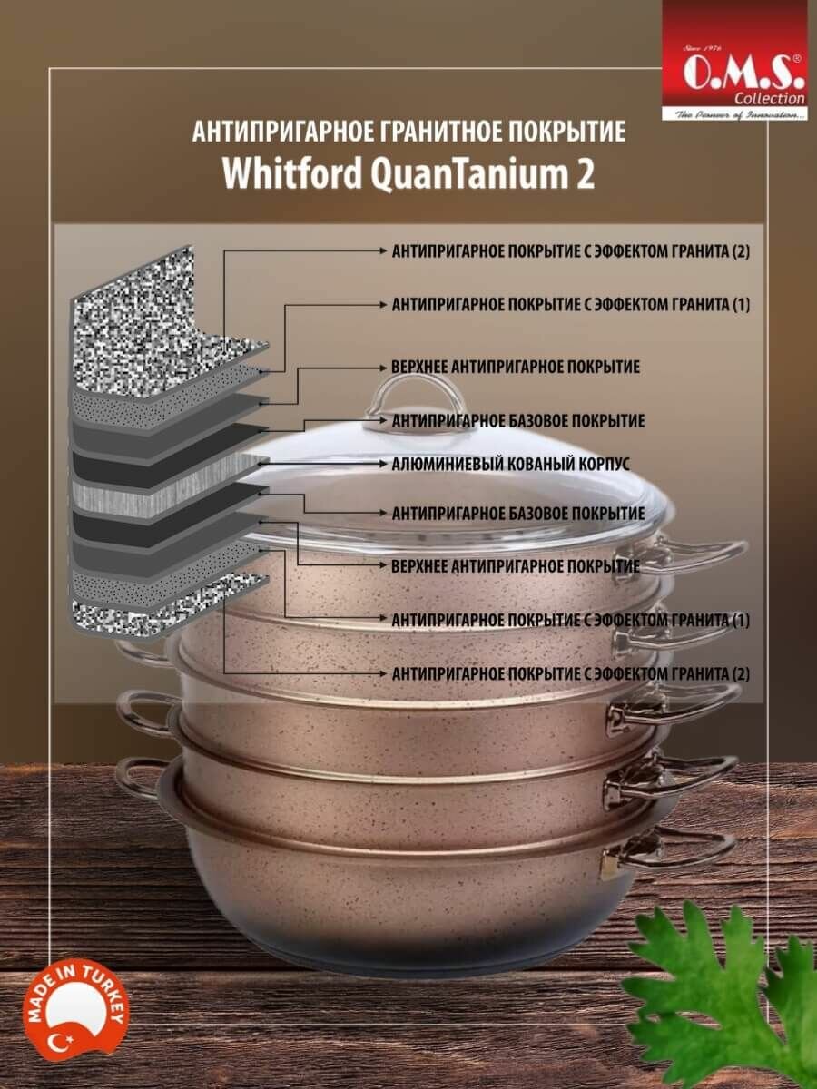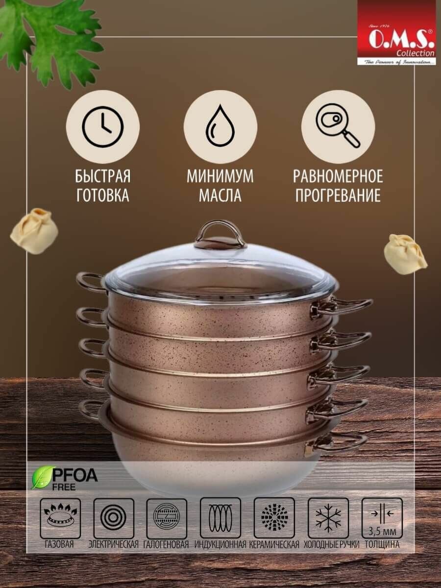 Мантоварка алюминиевая O.M.S. Collection, пароварка, имеет 4 яруса и диаметр 30 см. Она идеально подходит для приготовления мантов, пельменей, паровых булочек и других блюд, которые требуют паровой обработки. Мантница оснащена четырьмя паровыми корзинами идентичной высоты. Вы можете использовать их одновременно, либо по отдельности в том количестве, которое необходимо Вам. Нижняя чаша-кастрюля может использоваться отдельно от секций, для приготовления плова, рагу и других блюд, что делает мантоварку универсальным предметом Вашей кухни. Мантышница подходит для использования на всех типах плит: газовые, электрические, комбинированные, галогеновые, стеклокерамические, индукционные.