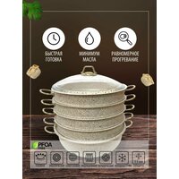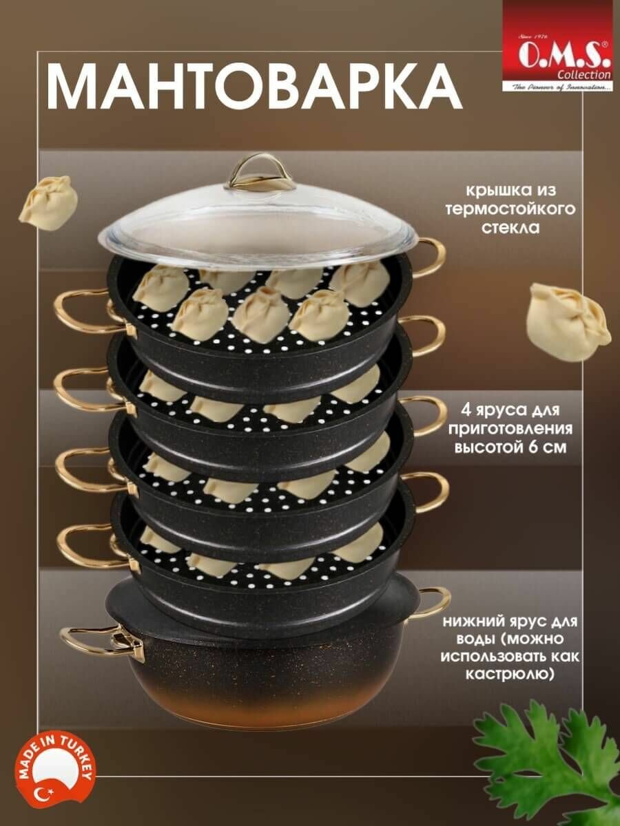 Мантоварка алюминиевая O.M.S. Collection, пароварка, имеет 4 яруса и диаметр 32 см. Она идеально подходит для приготовления мантов, пельменей, паровых булочек и других блюд, которые требуют паровой обработки. Мантница оснащена четырьмя паровыми корзинами идентичной высоты. Вы можете использовать их одновременно, либо по отдельности в том количестве, которое необходимо Вам. Нижняя чаша-кастрюля может использоваться отдельно от секций, для приготовления плова, рагу и других блюд, что делает мантоварку универсальным предметом Вашей кухни. Мантышница подходит для использования на всех типах плит: газовые, электрические, комбинированные, галогеновые, стеклокерамические, индукционные.