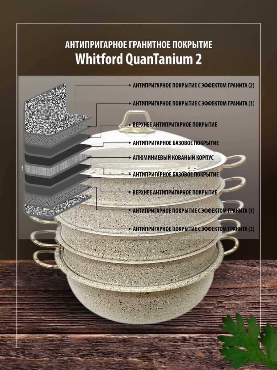 Посуда для индукции изготовлена из литого алюминия с особо прочным антипригарным покрытием Quantum2 внутри и снаружи, трехслойным c эффектом "гранит", на основе гранитно-минеральной крошки. Не содержит PFOA, APFO, C8, кадмий, свинец и другие вредные вещества и экологически безопасно. Не впитывает жир, цвет и запахи, что позволяет использовать ее с любыми продуктами и легко мыть. Капсульное 3х-слойное дно, которое равномерно распределяет тепло по всей поверхности чаши. Эргономичные ручки посуды выполнены из нержавеющей стали с надежным клепочным креплением, ручки остаются теплыми все время готовки. Купольная крышка выполнена из закаленного боросиликатного стекла с интегрированным по борту пароотводом, что позволяет готовить продукты в собственном соку.