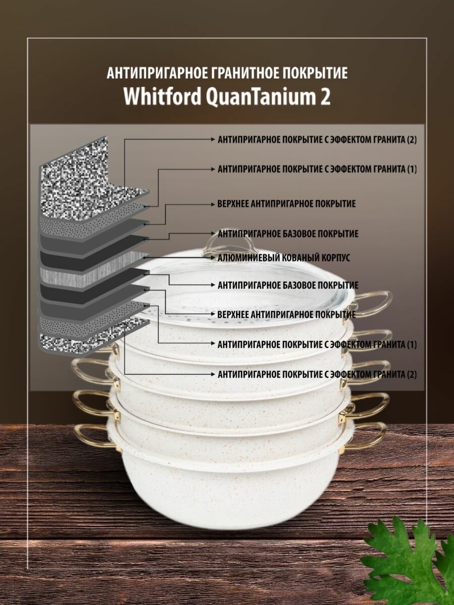 Посуда для индукции изготовлена из литого алюминия с особо прочным антипригарным покрытием Quantum2 внутри и снаружи, трехслойным c эффектом "гранит", на основе гранитно-минеральной крошки. Не содержит PFOA, APFO, C8, кадмий, свинец и другие вредные вещества и экологически безопасно. Не впитывает жир, цвет и запахи, что позволяет использовать ее с любыми продуктами и легко мыть. Капсульное 3х-слойное дно, которое равномерно распределяет тепло по всей поверхности чаши. Эргономичные ручки посуды выполнены из нержавеющей стали с надежным клепочным креплением, ручки остаются теплыми все время готовки. Купольная крышка выполнена из закаленного боросиликатного стекла с интегрированным по борту пароотводом, что позволяет готовить продукты в собственном соку.