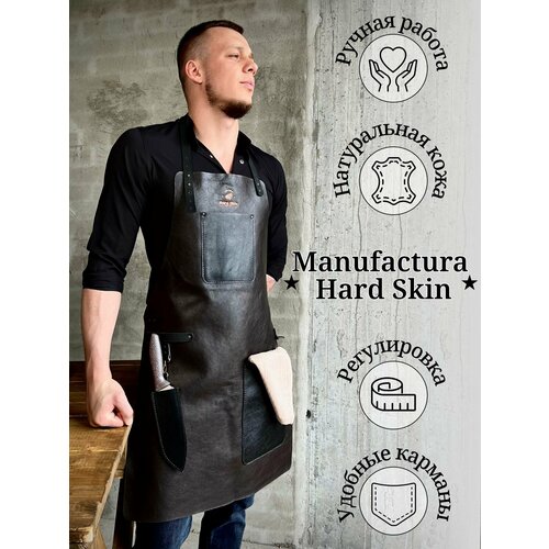 Manufactura HardSkin - Товарный знак № 883454 (регистр. от 02.08.2022 г.). Представляем мужской кожаный фартук — Manufactura HardSkin. Он идеально подходит для выполнения любых сложных работ, требующих защиты от высокой температуры, инородных предметов и других рисков. Брутальный, стильный, функциональный — все это можно сказать о современном фартуке мастера. Основные характеристики мужского фартука. Кожаный фартук для кухни и не только сделан из натурального материала. Никакой синтетики, никаких компромиссов. Только высококачественная бычья кожа профессиональной выделки, которая позволяет сохранять пластичность и эластичность, подгоняя по фигуре владельца. А также сочетать это с высокой прочностью и улучшенной защитой против любых внешних воздействий. Вы обязательно оцените следующие преимущества фартука для работы в мастерской. Износостойкая мягкая кожа, которая за счет своей текстуры не образует заломов и потертостей даже при крайне интенсивной эксплуатации. Выделка позволяет изделию аккуратно «ложиться» по фигуре, деформации не причиняют вреда и не ухудшают внешнего вида. Поверхность матовая, мужской рабочий фартук для работы в мастерской содержит более 20% жира. Специальная технология обработки натуральной кожи крупного рогатого скота позволяет сохранить природные свойства. Жир — это естественная защита от воды, высоких температур, агрессивных реагентов, включая кислоту или щелочь. Однако главным преимуществом можно отметить влагоотталкивающий эффект, который гарантирует, что кожаный фартук для гриля и других поварских занятий всегда будет оставаться в идеальном состоянии. Даже при высоком загрязнении, например, если вы используете изделие как кожаный фартук для барбекю, испачкали его мясом, соусами, будет несложно удалить грязь. Очищается простой влажной тряпкой с небольшим количеством хозяйственного мыла, не требует сложных манипуляций для возвращения идеального вида. Основа кожаного фартука мясника, повара — прочный материал. Это означает 100% защиту даже против опасных брызг раскаленного масла, жира, а также если использовать в мастерской — то спасет даже от железной стружки, опилок и других потенциально токсичных или травматичных веществ. Наш фартук смотрится брутально, поэтому подходит в том числе как фартук в подарок на юбилей, а карманы добавят удобства. Сами карманы стоит отметить отдельно, потому что они упростят все виды работ — можно класть внутрь инструменты. Эти элементы не декоративные, а исключительно функциональные. Положите в карманы то, что нужно, сэкономив рабочее время на походах за необходимым инструментом. Эргономичный кожаный фартук кузнеца, повара, мастера — то, что реально поможет не только в защите одежды и тела, но и улучшит качество работы. Прочные карманы позволят любому помещенному внутрь инструменту оказаться в полной безопасности от внешних воздействий. Стильное сочетание оттенков превосходно гармонирует между собой, придавая выразительности и брутальности всей фигуре владельца. Также есть дополнительные элементы для удобства — лямка под полотенце, карабин и кольцо, чтобы можно было без усилий вешать фартук с кожаными лямками в шкафу и не только. Верхняя лямка для шеи регулируемая, поэтому вы всегда можете «настроить» изделие под свой рост и габариты. У нас Вы можете найти удачный мужск