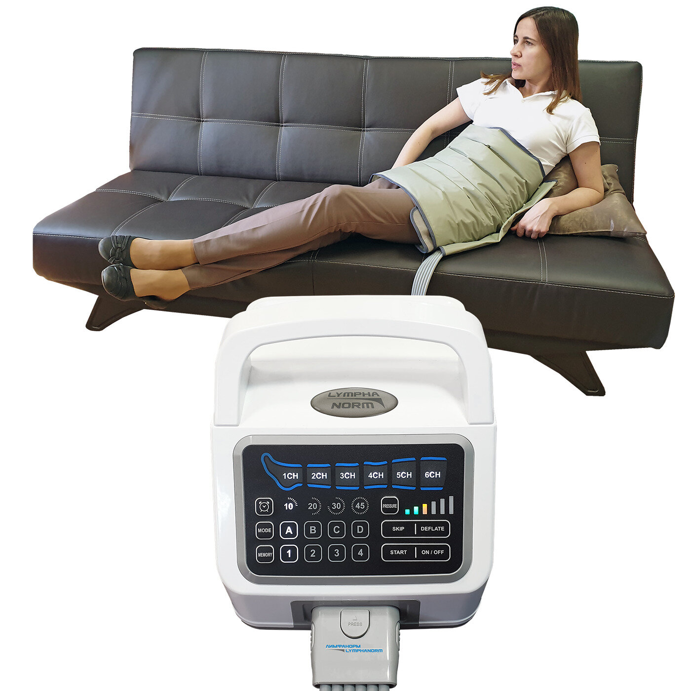 Дополнительная опция к 6ти канальным аппаратам для прессотерапии (лимфодренажа) - манжета для талии - позволяет проводить сеансы лимфодренажа в области талии. Манжета для талии высотой 50 см (размер XXL: длина до 136 см) оказывает воздействие на талию, живот, поясничную область и бёдра. При регулярном использовании этого аксессуара укрепляются мышцы живота и разбиваются жировые отложения в области талии. При желании можно опустить манжету ниже талии и провести массаж верхней части ног. Манжета фиксируется на теле пациента с помощью липучки. Удобная надежная застёжка рассчитана на многократные расстегивания и застегивания. Пояс разделён на 6 камер, от каждой из которых отходит силиконовый шланг. Шланги сходятся вместе и соединяются в общий разъём, который подсоединяется к аппарату. Манжета для талии совместима с 6ти канальными аппаратами для прессотерапии (лимфодренажа) LymphaNorm (ЛимфаНорм)/ Unix Lympha Pro.