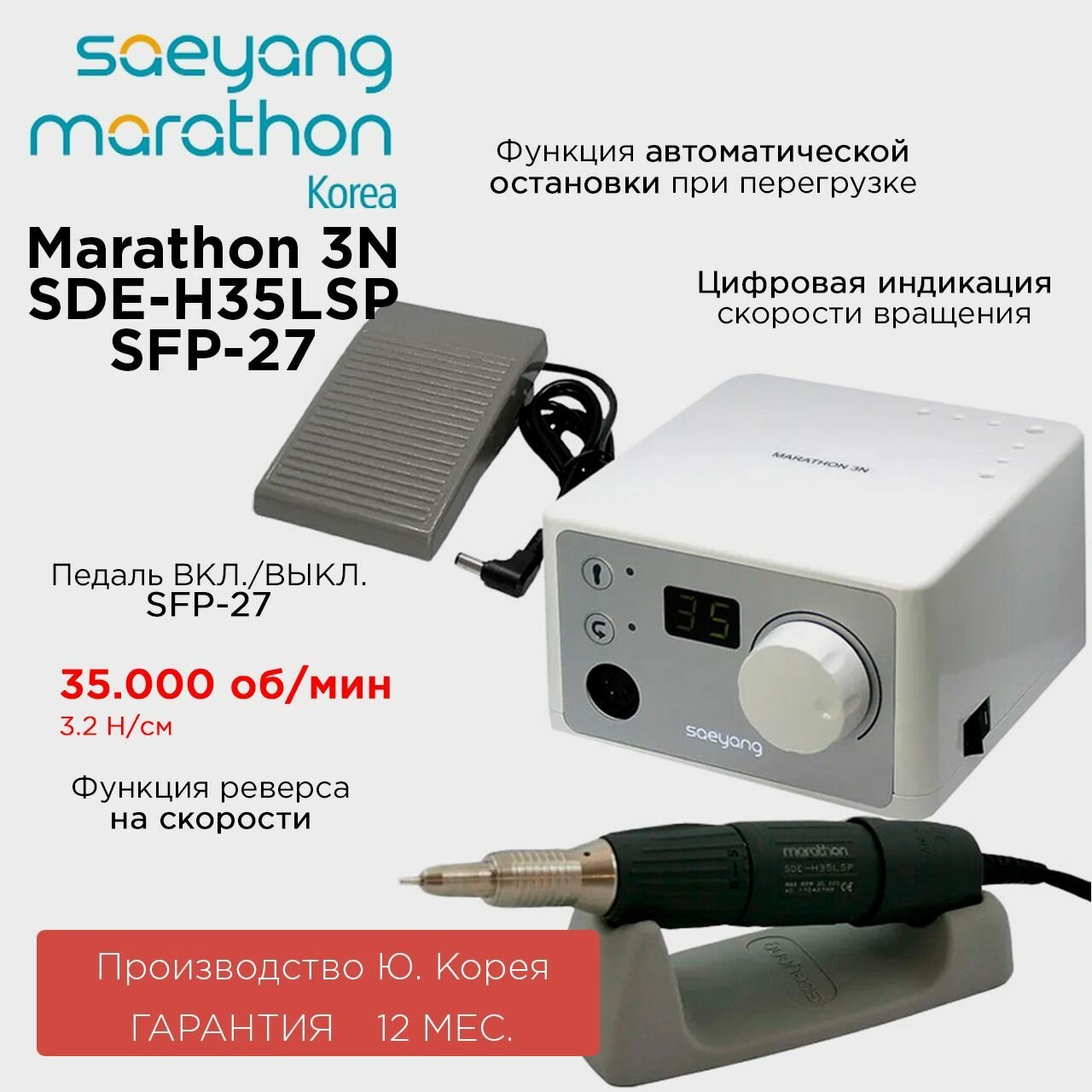 Оригинальный Marathon 3N - косметологический аппарат для маникюра с наконечником H35LSP, 35000 об/мин, крутящий момент 3.2 Н/см, мощность 45 Вт, педаль SFP-27 (вкл/выкл), производство Saeyang Microtech (Ю. Корея) с гарантией в официальных сервисных центрах по всей России.