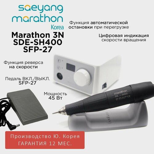 Оригинальный Marathon 3N с педалью вкл/выкл SFP-27 - косметологический аппарат для маникюра с наконечником SH400, 40000 об/мин, крутящий момент 5 Н/см, мощность 45 Вт, производство Saeyang Microtech (Ю. Корея) с гарантией в официальных сервисных центрах по всей России.