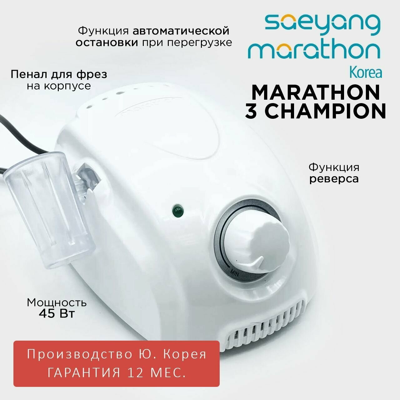 Marathon 3 Champion New - аппарат для маникюра с наконечником SDE-H35LSP, с педалью включения SFP-27. Скорость от 0 до 35000 об/мин, крутящий момент 3.2 Н/см, мощность 45 Вт, производство Saeyang Microtech (Ю. Корея) с гарантией в официальных сервисных центрах по всей России.