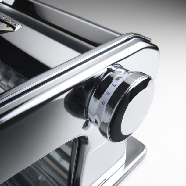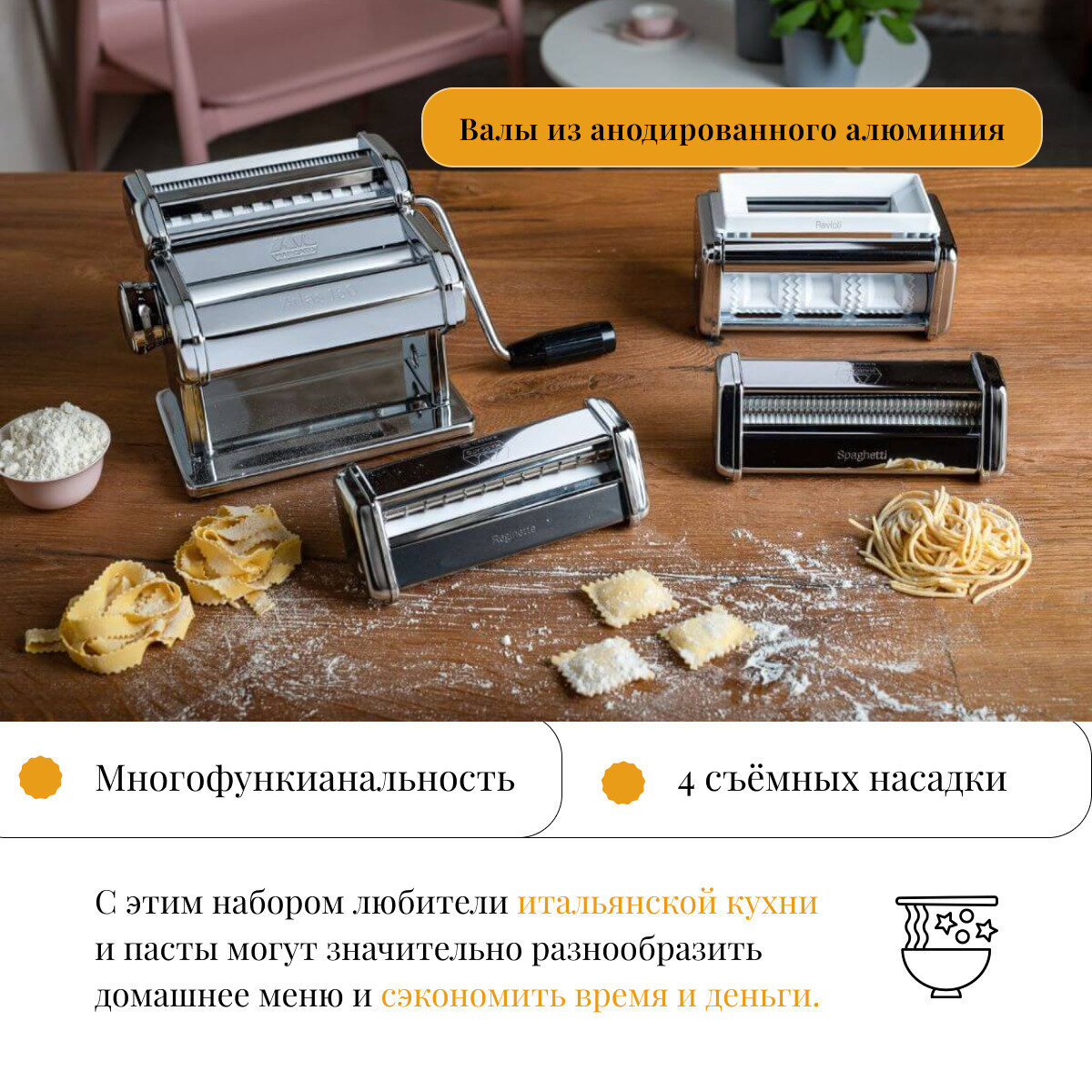 тестораскаточная машина и лапшерезка Atlas 150, съёмная насадка для приготовления двух видов пасты: широких феттуччине 6,5 мм и тоненьких тальятелле 1,5 мм насадка для спагетти, насадка регинетте, насадка для равиоли – пельменей в размере "мини" 4,5х4,5 см.