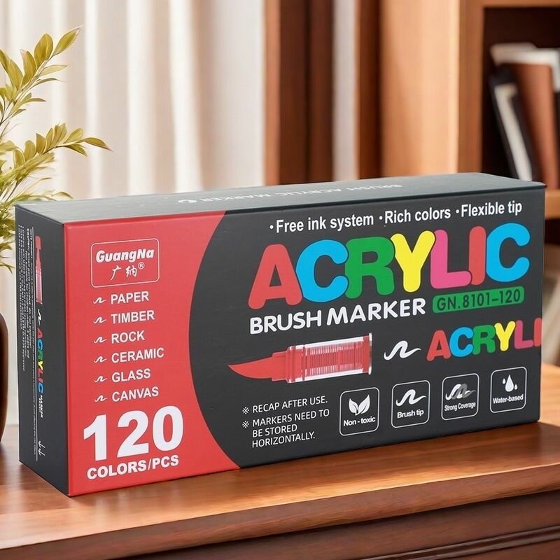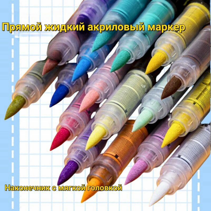Новый жидкий акриловый маркер с мягкой головкой, не требующий нажатия, обеспечивает равномерное нанесение чернил, непроницаемый цвет, возможность наращивания, быстро сохнет. Привнесите в свою картину небывалую радость. Спецификация: 120/24/36/48/60/72 цветаЕмкость чернил: 24 гНаконечник: мягкая головкаОсобенности продукта:① интеллектуальная система прямого управления жидкими чернилами: независимый регулятор подачи чернил, уменьшающий расслоение чернил и делающий чернила более однородными.✅ профессиональные акриловые чернила: добавляют тонкие пигменты с высоким содержанием пигмента, обеспечивают высокое качество тона, прочное покрытие, долго не выцветают, безопасны и не имеют запаха.③ Высокоэластичная мягкая головка: изготовлена из нейлонового волокна, она износостойкая и долговечная. Заостренный кончик позволяет рисовать тонкие линии, а толстые линии и мазки кистью можно наносить кисточкой сбоку, медленно нанося отметки пером более равномерно. Сфера применения:Меры предосторожности при обработке поверхностей из большинства материалов, таких как бумага, стекло, камень, ткань, гука, пластик, гипс, дерево, нейл-арт и т. д.:Меры предосторожности при использовании:Встряхните его перед использованием, чтобы чернил выделилось больше, а цвет стал более густым.|1. Перед использованием встряхните держатель пера вверх-вниз, чтобы вытравить больше чернил,Цвет становится более насыщенным.2. В процессе создания, пожалуйста, плотно закрывайте колпачок при замене пера или неиспользовании пера, чтобы продлить срок его службы.3. Акриловые чернила - это осажденные чернила. После завершения создания, пожалуйста, плотно закройте колпачок и храните ручку горизонтально.