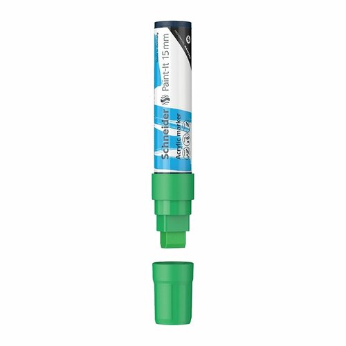 Schneider Paint-It 330 - акриловый маркер для творчества и хобби. Толщина линии – 15 мм, форма наконечника – прямоугольная, цвет чернил - зеленый. Акриловые чернила на водной основе быстро сохнут, обеспечивают интенсивность цвета, высокие укрывные свойства и стойкость после высыхания. Не содержат ксилол и толуол. Подходит для работ на различных поверхностях: бумага, дерево, камень, гипс и т. д. Перед использованием маркер необходимо встряхнуть для смешивания и равномерной подачи чернил. • Цвет чернил: зеленый; • Толщина линии письма: 15 мм; • Страна производства: Германия