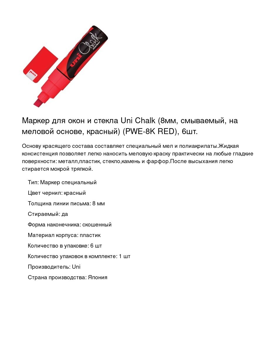 Маркер для окон и стекла Uni Chalk (8мм, смываемый, на меловой основе, красный) (PWE-8K RED), 6шт.: сравнение цен, характеристики, фото, актуальное наличие и цены.