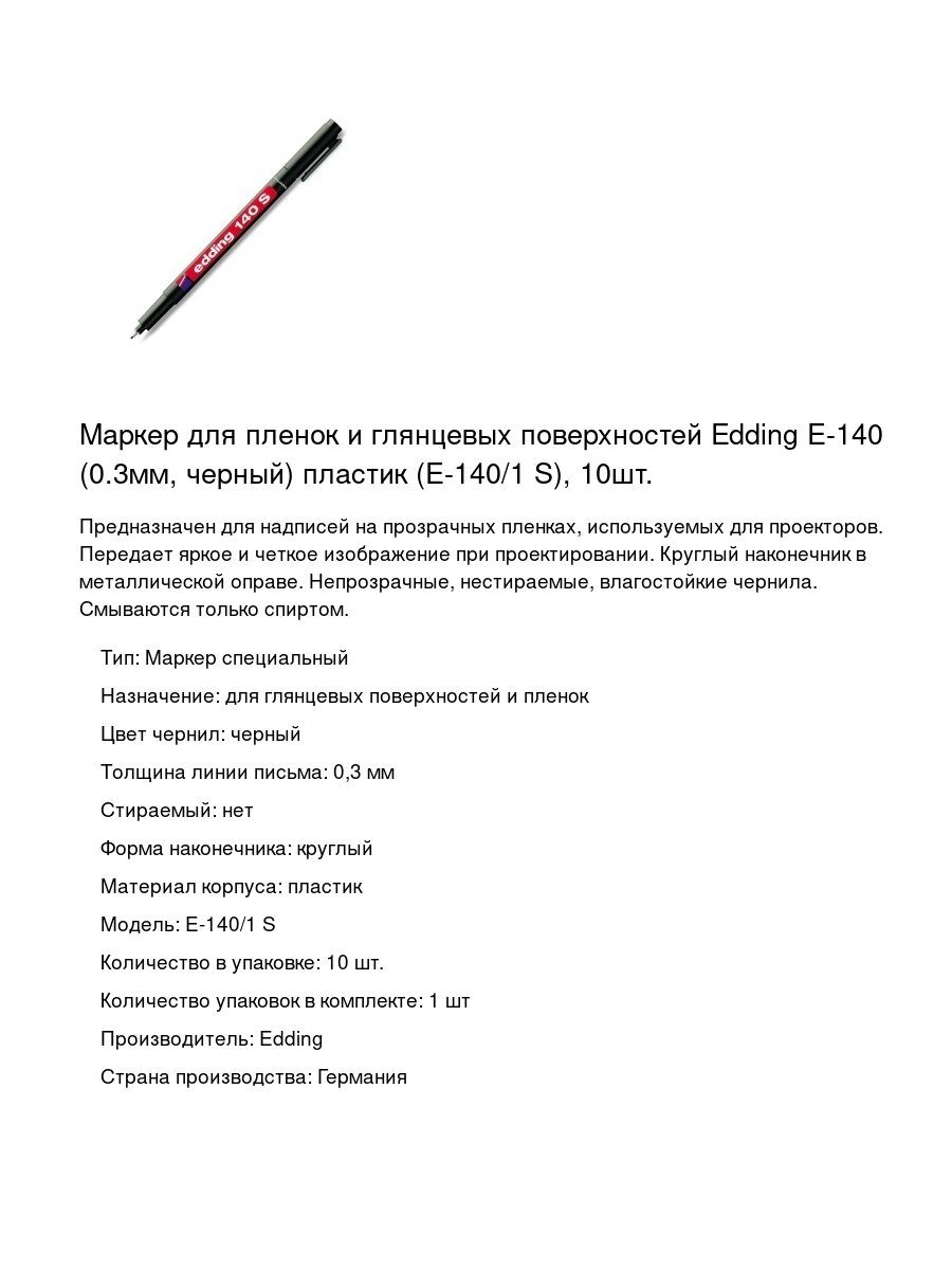 Маркер для пленок и глянцевых поверхностей Edding E-140 (0.3мм, черный) пластик (E-140/1 S), 10шт.: сравнение цен, характеристики, фото, актуальное наличие и цены.