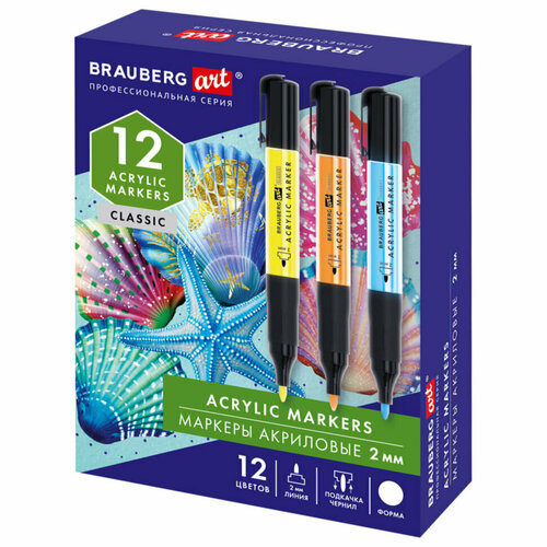Маркеры BRAUBERG ART 152519Маркеры акриловые для рисования и хобби, 12 ярких цветов, линия 2 мм, BRAUBERG ART CLASSIC,152519Набор акриловых маркеров BRAUBERG ART CLASSIC – это универсальный инструмент для письма, рисования и декорирования. Предназначены для использования на плотной бумаге, холсте, дереве, керамике, камне, стекле, коже. Набор акриловых маркеров с круглой формой корпуса из пластика и удобной прорезиненной ручкой, удобной для письма и рисования. В комплекте 12 ярких цветов. Форма наконечника – круглая. Толщина линии письма – 2 мм. Объем краски – 3,5 мл. Пигментированная акриловая краска на водной основе практически не имеет запаха, после высыхания обладает повышенной светостойкостью и водостойкостью. Краска обладает превосходной укрывистостью. Благодаря водной основе краска быстро сохнет и не размазывается. Надежный помповый механизм подачи краски предотвращает вытекание и разбрызгивание в процессе использования, а также преждевременное высыхание. Износостойкий фетровый наконечник устойчив к повреждениям и обеспечивает экономный расход чернил. Изделие не перезаправляется. Плотно закрывается колпачком, что предотвращает высыхание наконечника и чернил. Набор акриловых маркеров пригодится школьникам, студентам, участникам мастер-классов, ученикам художественных школ, студий и училищ, живописных мастерских. Отлично подойдут для работы дома или на пленэре. Эти акриловые маркеры используют любители в качестве хобби и профессионалы, которые стремятся достичь такой же славы, как Пабло Пикассо (Pablo Picasso), Казимир Малевич, Марк Шагал, Клод Моне (Claude Monet), Рембрандт (Rembrandt), Сальвадор Дали (Salvador Dali), Энди Уорхол (Andy Warhol), Андрей Рублев, Фрида Кало (Frida Kahlo), Ван Гог (Vincent van Gogh), Тициан (Tician), Анри Матисс (Henri Matisse), Леонардо да Винчи (Leonardo da Vinci) и другие популярные художники и артисты. Цвет чернил: ассорти. Серия: CLASSIC Modern. Количество в комплекте: 12 шт. Форма наконечника: круглая. Минимальная толщина линии письма: 2 мм. Максимальная толщина линии письма: 2 мм. Тип чернил: водостойкие, перманентные, светостойкие. Форма корпуса: круглая. Диаметр корпуса: 16 мм. Материал корпуса: пластик. Наличие клипа: да. Основа чернил: водная. Упаковка: картонная коробка Бренд - BRAUBERG ART. Производитель - Китай. Артикул производителя - 152519. Штрихкод - 4606224416328Характеристики упаковки: Вес:0,3070 кг. Объем: 0,0007 м3. Размеры: 3,6x13,4x10,1 см.