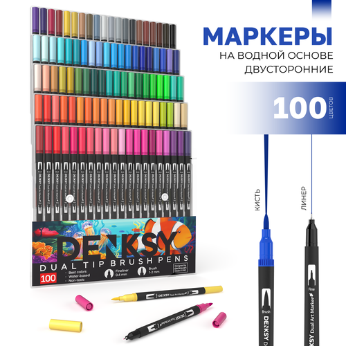 Набор двусторонних водных маркеров содержит 100 ярких цветов. Каждый маркер имеет два наконечника: толстый наконечник с кистью (брашпен) - для заполнения больших поверхностей, и тонкий наконечник линер (лайнер) – для прорисовки деталей и линий. Перья и чернила фломастеров японского производства. Водные маркеры могут быть использованы для скетчинга, дизайна и создания комиксов. Благодаря двум наконечникам они подходят для рисования, граффити, скрапбукинга, оформления открыток и подарков, и других творческих проектов. Тонкая капиллярная ручка с одной стороны маркера, позволяет использовать его для письма. Другая сторона маркера кисть можно использовать для каллиграфии и леттеринга. Маркеры размываются водой и их можно назвать акварельные маркеры. Они будут полезны как для детей, так и для взрослых, художников и школьников. Наконечники обеспечивают разнообразие толщины линий и позволяют создавать различные эффекты, включая градиенты, капиллярные рисунки, а также тонкие линии и густые закрашивания. Маркеры можно применять в творчестве вместе с карандашом, ручкой, акварелью, и другими красками. Чернила на водной основе, но они не выцветают и не имеют неприятного запаха. Помимо бумаги, холста и картона, они также подходят для использования на других поверхностях, включая пластик, дерево и металл. Набор двусторонних фломастеров (36 штук) пригодится ребенку в школе, на уроках изо, а также будет отличным развивающим хобби для домашнего творчества. Набор маркеров для скетчей идеально подходит для тех, кто увлекается живописью, искусством и рукоделием, а также для тех, кто ищет подарок для юного художника. Идеальный подарок, лучший подарок для ребенка!
