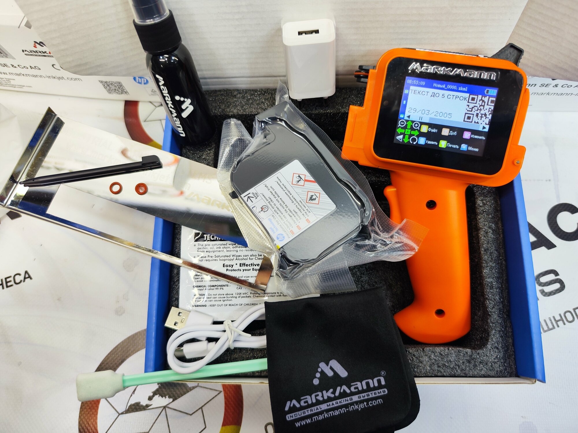В комплекте с принтером идут картридж с сольвентными чернилами, зарядное устройство, стилус и инструкция по эксплуатации. MarkMann UltraJet 1380 прост в использовании и не требует специальных навыков для работы с ним.