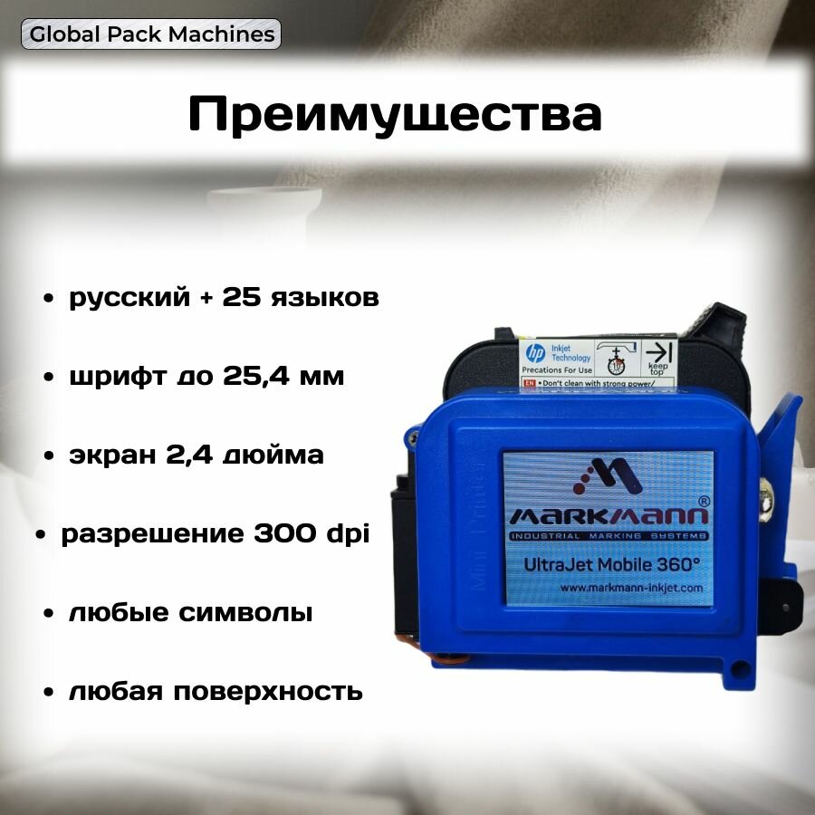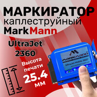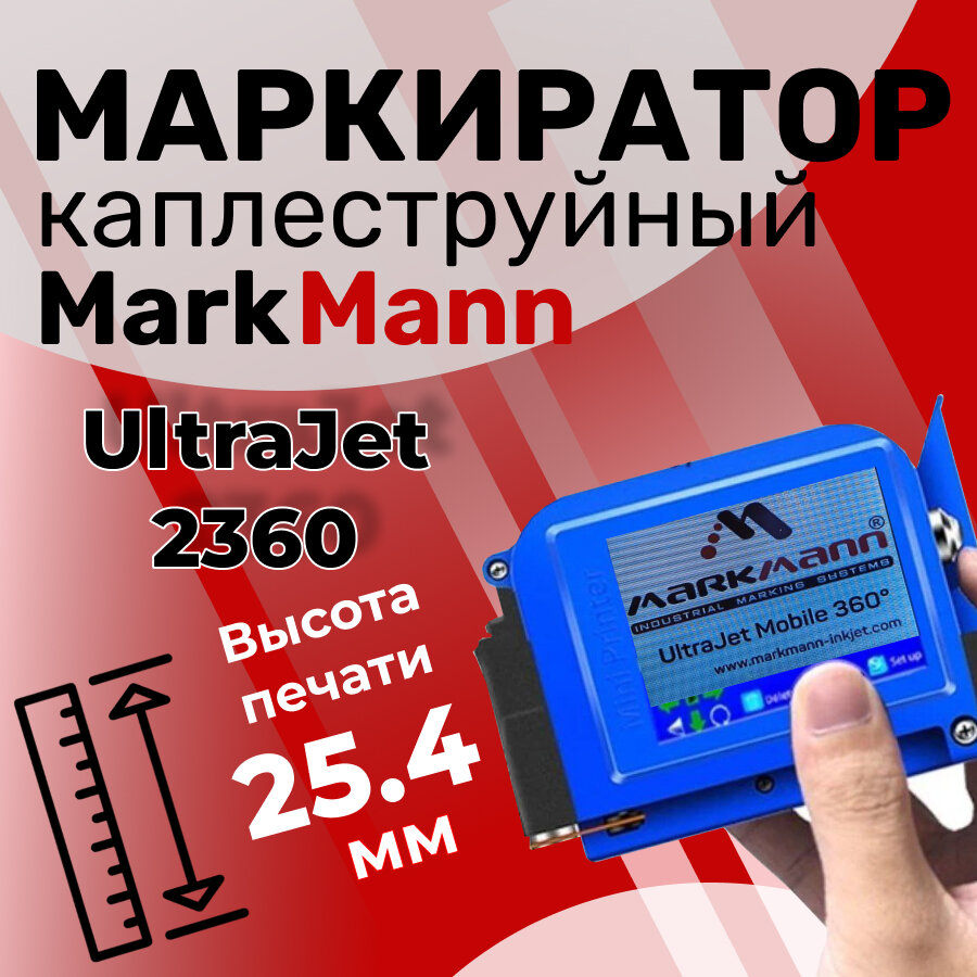 Высота печати составляет 25,4 мм, что позволяет маркировать мелкие детали. MarkMann UltraJet 2360 поддерживает 25 языков, включая русский, и может печатать цифры, даты, символы, QR-коды и другие изображения.
