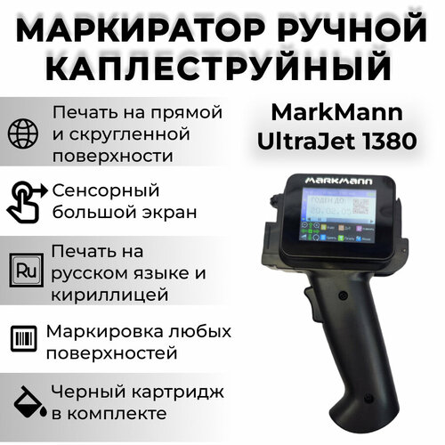 MarkMann UltraJet 1380 - это принтер с возможностью печати на русском языке и кириллицей, который используется для печати торговых марок, кодов даты, графиков, двумерных кодов, QR-кодов и другой информации. Устройство может наносить маркировку на различные поверхности, такие как бутылки, баночки, коробки, пищевые пакеты, упаковки, сталь, ПВХ, трубы, дерево, листовой металл, бетон, стекло и ткань.
