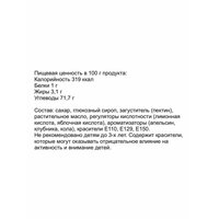 Состав: сахар, глюкозный сироп, загуститель (пектин), растительное масло, регуляторы кислотности (лимонная кислота, яблочная кислота), ароматизаторы (апельсин, клубника, кола), красители Е110, Е129, Е150. Не рекомендовано детям до 3-х лет. Содержит красители Е110, Е129, которые могут оказывать отрицательное влияние на активность и внимание детей. Пищевая ценность на 100 г продукта: белки - 1 г, жиры - 3,1 г, углеводы - 71,7 г. Энергетическая ценность на 100 г продукта: 1336 кДж/319 ккал. Продукты: Да Температурное ограничение: Нет Вес нетто, г: 12 Вид: Желейный Вкус: Ассорти