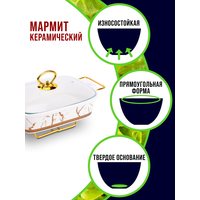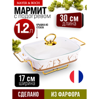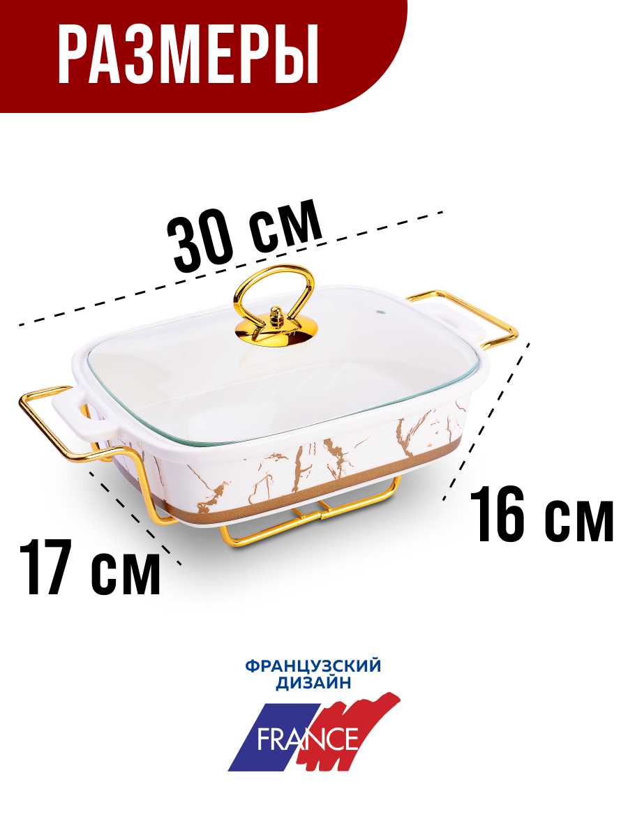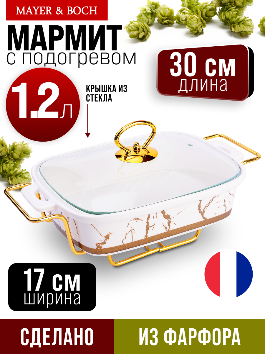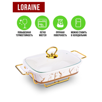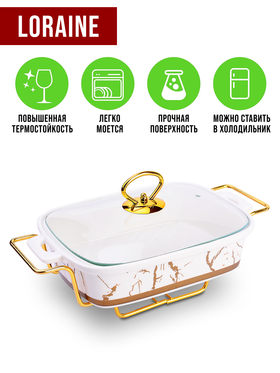 Мармит LORAINE выполнен из фарфора белого цвета, украшенной золотым рисунком. Фарфоровая чаша с удобными ручками располагается на металлической подставке с одним подсвечником для чайной свечи (свеча в комплект не входит). Свеча, устанавливающаяся на подставке, нагревает чашу снизу, таким образом поддерживая нужную температуру приготовленного блюда. Стеклянная крышка с удобной ручкой плотно прикрывает чашу сверху, в свою очередь также не давая остыть блюду. Благодаря своему элегантному дизайну, мармит с приготовленным блюдом можно сразу подавать на стол, не перекладывая еду на сервировочные тарелки. Изящный, с современным дизайном, мармит украсит любой праздничный стол, а блюда в нем будут всегда теплыми и ароматными. Фарфоровая чаша (без подставки) подходит для использования в духовом шкафу. Не подходит для мытья в посудомоечной машине. Подходит для хранения в холодильнике. Мармит на 1 свечу LR; Материал чаши: фарфор; Форма: прямоугольная; Объем: 1,2 л; Материал крышки: стекло; Материа.