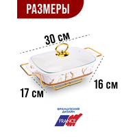 Размер чаши: 30 х 20,8 х 6 см. Размер подставки: длина 39 см, ширина 22,5 см, высота без ручек 9,5 см, высота с ручками 14,5 см.