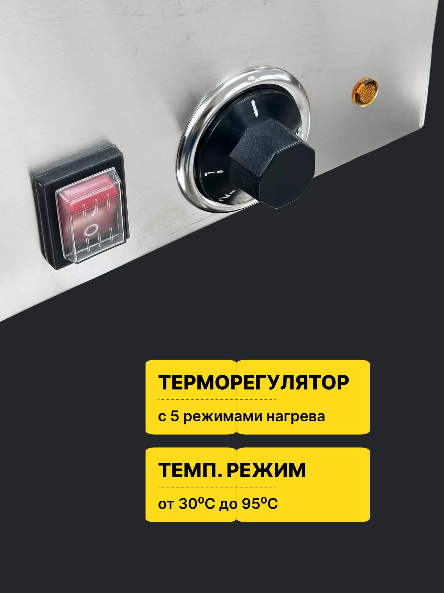 Бренд: EKSI Длина: 535 мм Ширина: 340 мм Высота: 240 мм Вес (без упаковки): 7.1 кг Напряжение: 220 В Потребляемая мощность: 1.2 кВт Панель управления: электромеханическая Материал корпуса: нержавеющая сталь Тип нагрева: водяной