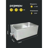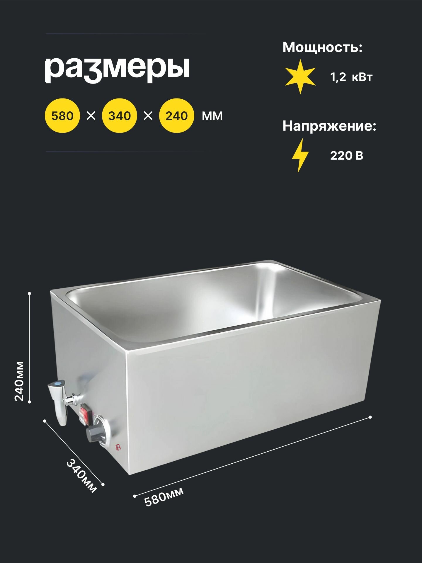 Вместимость гастроёмкостей: 3 × GN1/3-150; 2 × GN1/2-150; 1 × GN1/1-150 (в комплект не входят) Количество уровней мощности: 5 Кран для слива воды: есть Вес в упаковке: 8.4 кг