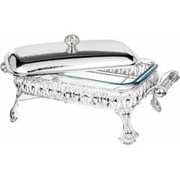 Мармит состоит из стеклянной формы с крышкой из нержавеющей стали и металлической подставки с резным декором и ячейкой под свечу. Общий размер мармита составляет 47 х 25 см, высота без крышки 14 см, а с учетом крышки 20 см. Стеклянная прямоугольная форма имеет объем 2200 мл, размер с учетом ее ручек 39 х 23.5 х 6.5 см, а ее рабочая емкость размер 33 х 23 см и глубину 6 см. Подставка имеет два углубления под чайные свечи диаметром 4 см. (Свечи приобретаются отдельно).
