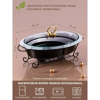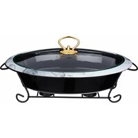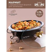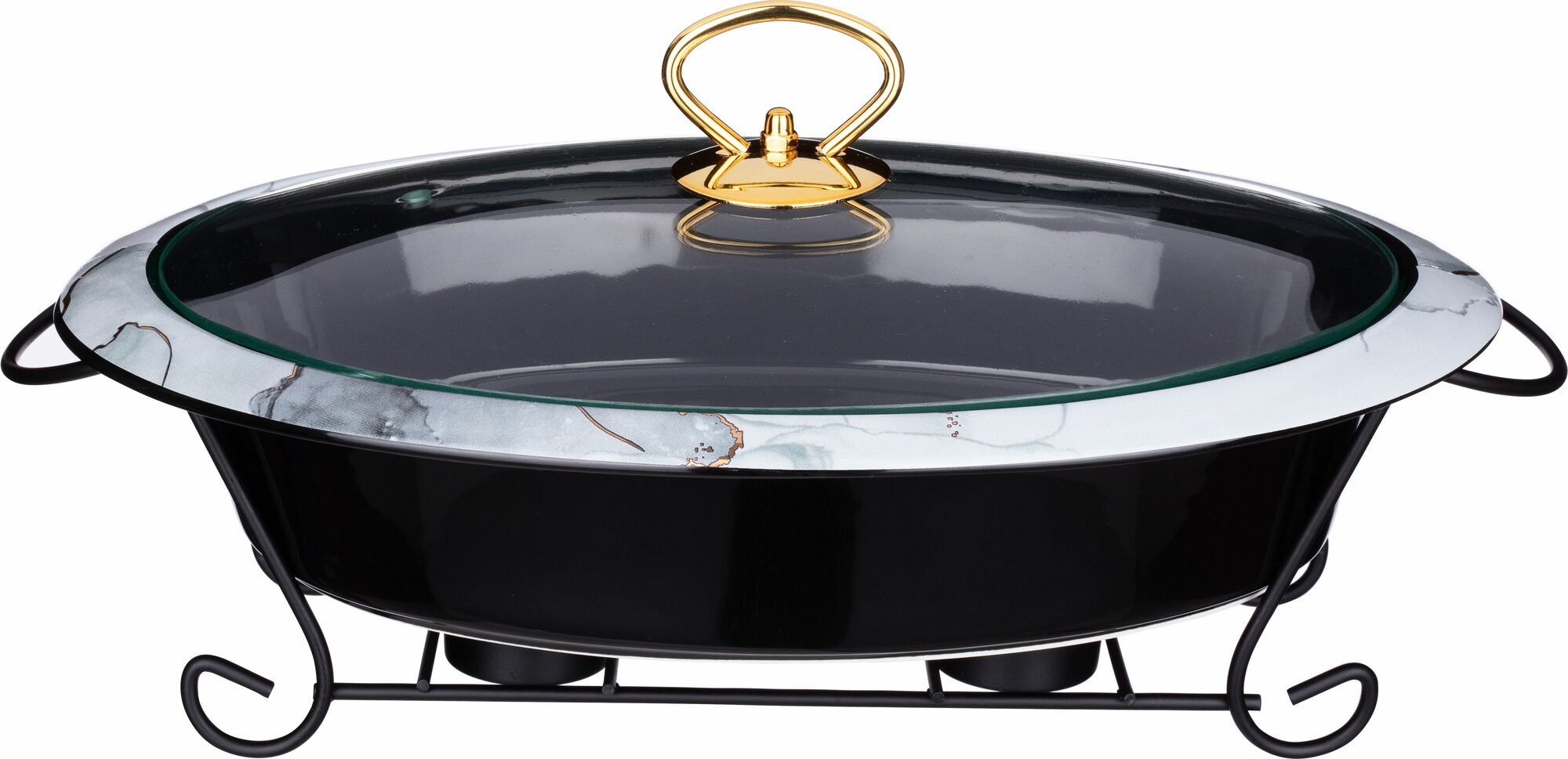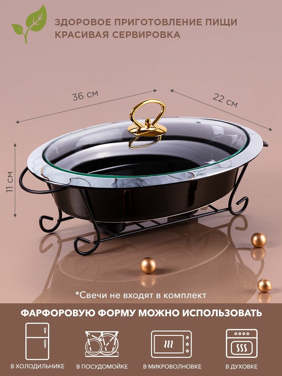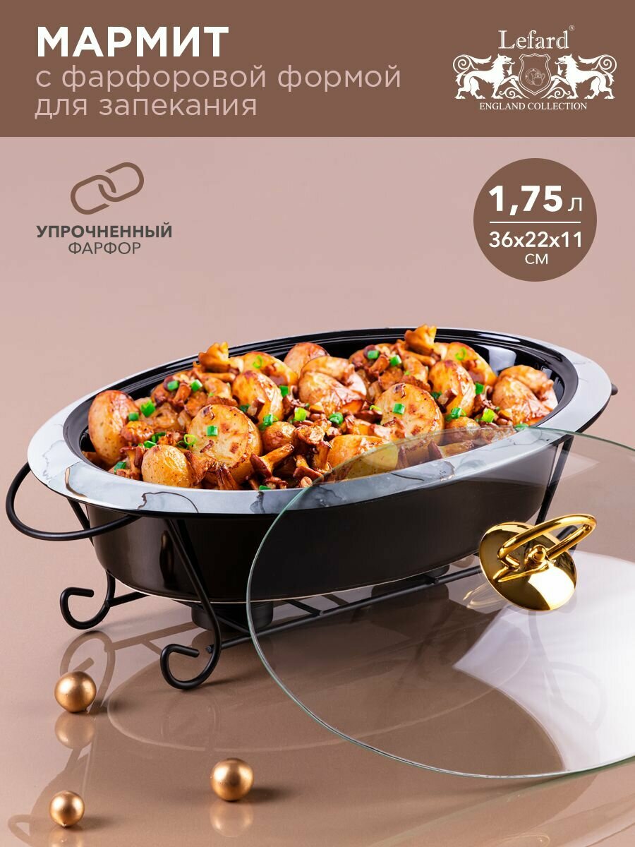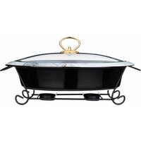 Мармит со стеклянной крышкой на металлической подставке овальный "MOON ART" 1,75 л 36х22х11 см, черный. Коллекция "Moon Art" ТМ LEFARD - это ультрасовременная сервировка стола. Модный абстрактный дизайн, в котором нет ничего лишнего, неважного для выражения мысли. Космическая новая реальность, в которой нет ничего общего с окружающей действительностью. Изделия выполнены из упрочненного фарфора. Четкие линии, сверкающее глянцевое покрытие. Ваш стол неотразим! Посуда прошла сертификацию. Безопасна для контакта с пищевыми продуктами. Можно использовать в микроволновой печи. Рекомендуется применять мягкие средства для мытья в посудомоечной машине. Металлические элементы нельзя использовать в микроволновой печи.