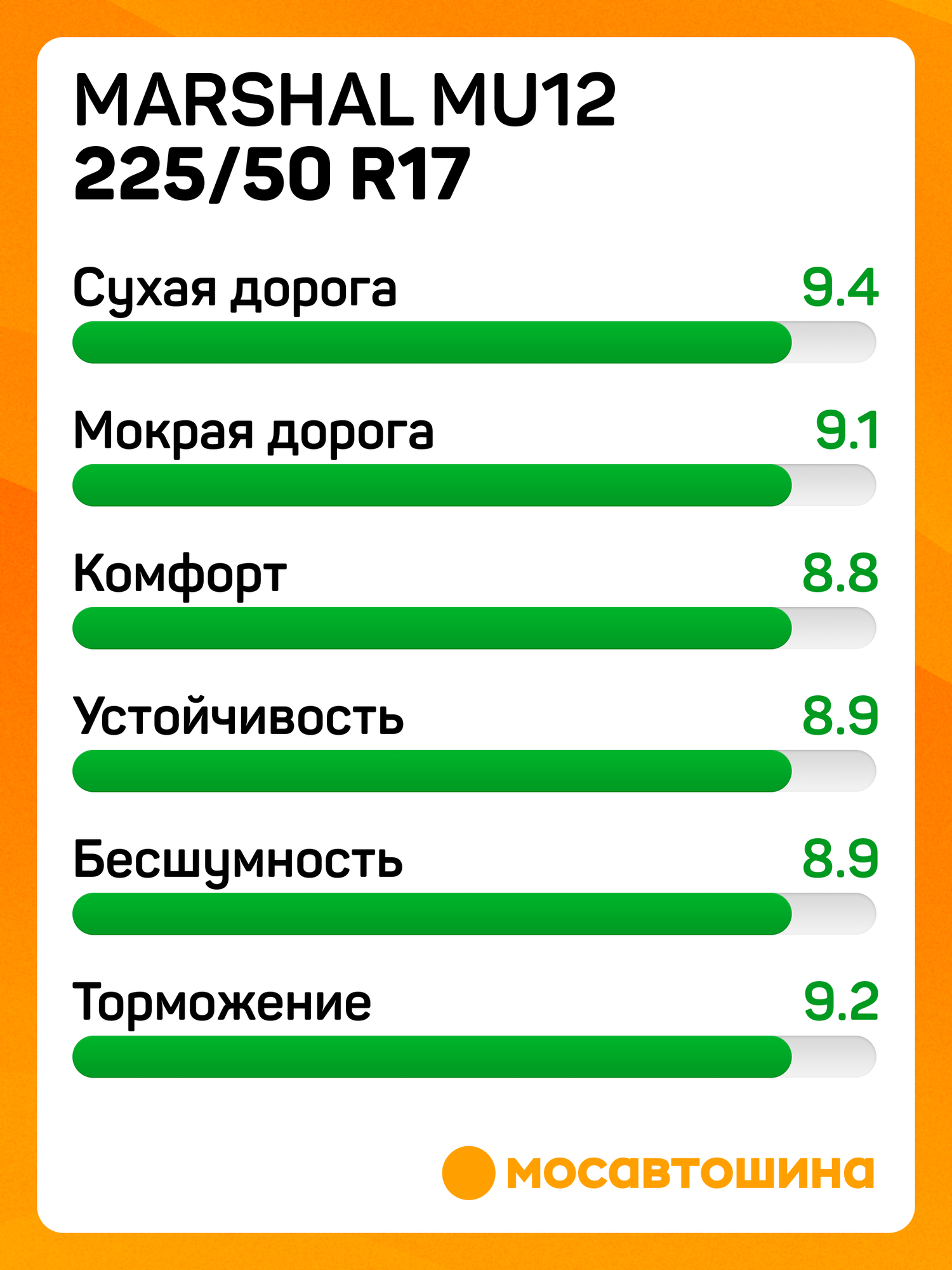 Marshal MU12 – легковая летняя авторезина ультра высокой производительности (класс UHP) с асимметричным дизайном протектора. Она обеспечивает быстрое торможение и стабильную лёгкую управляемость в мокрых и сухих дорожных условиях. И более того, характеризуется хорошей сопротивляемостью аквапланингу и высокой стойкостью к износу. Летняя шина Marshal MU12 предназначена для наиболее мощных модификаций легковых автомобилей малого и среднего класса. Разработана специалистами компании Kumho для замены модели с индексом MU 11. Отличается от нее созданным заново дизайном протектора и составом резиновой смеси. Протектор шины отличается асимметричным дизайном. Характерной его чертой являются увеличенные в сравнении с покрышкой предыдущего поколения размеры элементов. По сути, протекторный рисунок представляет собой три широких продольных ребра в центре и несколько сотен блоков в плечевых зонах. Такой дизайн обеспечивает максимальные размеры пятна контакта, мало меняющиеся под воздействием разнонаправленных сил ускорения. Это гарантирует постоянство сцепных свойств в любых условиях. Одним из основных нововведений стал обновленный компаунд. Он отличается использованием бутадиен-стирольного каучука с повышенным содержанием стирола. Благодаря этому протектор стал гораздо лучше цепляться даже за мокрое покрытие, плотно облегая самые мелкие неровности на его поверхности. При этом удаление воды осуществляется не только широкими продольными канавками, но и прорезанными в центральных ребрах узкими ламелями. Основные особенности Marshal MU12: — асимметричный протектор увеличивает пятно контакта; — оптимизированная форма профиля улучшает сцепление в сложных ситуациях; — обновленный бутадиен-стирольный компаунд. Купить шины Marshal Вы можете в Интернет-магазине шин и дисков Market-Shina. ru. Зимние шины и летние шины всегда в наличии, от нас низкая цена и полный каталог шин на все легковые шины. Мы даем гарантию на автомобильные шины Marshal от завода изготовителя. Магазин шин и дисков Маркет-шина. ру – это надежно, профессионально и недорого.