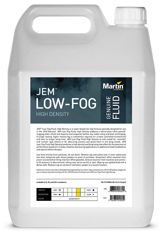 Жидкость на водной основе JEM Low-Fog, High Density предназначена для использования в генераторах тяжелого дыма С ее помощью можно получить эффект очень плотного, кристально-белого дыма, клубящегося на земле, который растворяется в пространстве без сильного поднятия вверх. Преимуществом данной жидкости является более длительный период рассеивания, который можно увеличить в контролируемой среде.