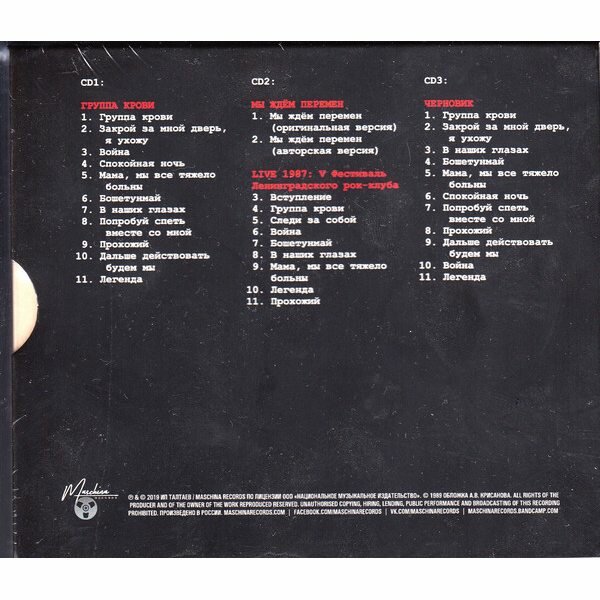 Трек-лист: CD 1: 01 — Группа Крови 02 — Закрой За Мной Дверь, Я Ухожу 03 — Война 04 — Спокойная Ночь 05 — Мама, Мы Все Тяжело Больны 06 — Бошетунмай 07 — В Наших Глазах 08 — Попробуй Спеть Вместе Со Мной 09 — Прохожий 10 — Дальше Действовать Будем Мы 11 — Легенда CD 2. Группа Крови: Дополнения: 01 — Мы Ждём Перемен (Оригинальная Версия) 02 — Мы Ждём Перемен (Авторская Версия) Live 1987: V Фестиваль Ленинградского Рок-клуба 03 — Вступление 04 — Группа Крови 05 — Следи За Собой 06 — Война 07 — Бошетунмай 08 — В Наших Глазах 09 — Мама, Мы Все Тяжело Больны 10 — Легенда 11 — Прохожий CD 3. Черновик: 01 — Группа Крови 02 — Закрой За Мной Дверь, Я Ухожу 03 — В Наших Глазах 04 — Бошетунмай 05 — Мама, Мы Все Тяжело Больны 06 — Спокойная Ночь 07 — Попробуй Спеть Вместе Со Мной 08 — Прохожий 09 — Дальше Действовать Будем Мы 10 — Война 11 — Легенда