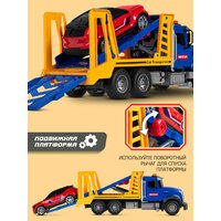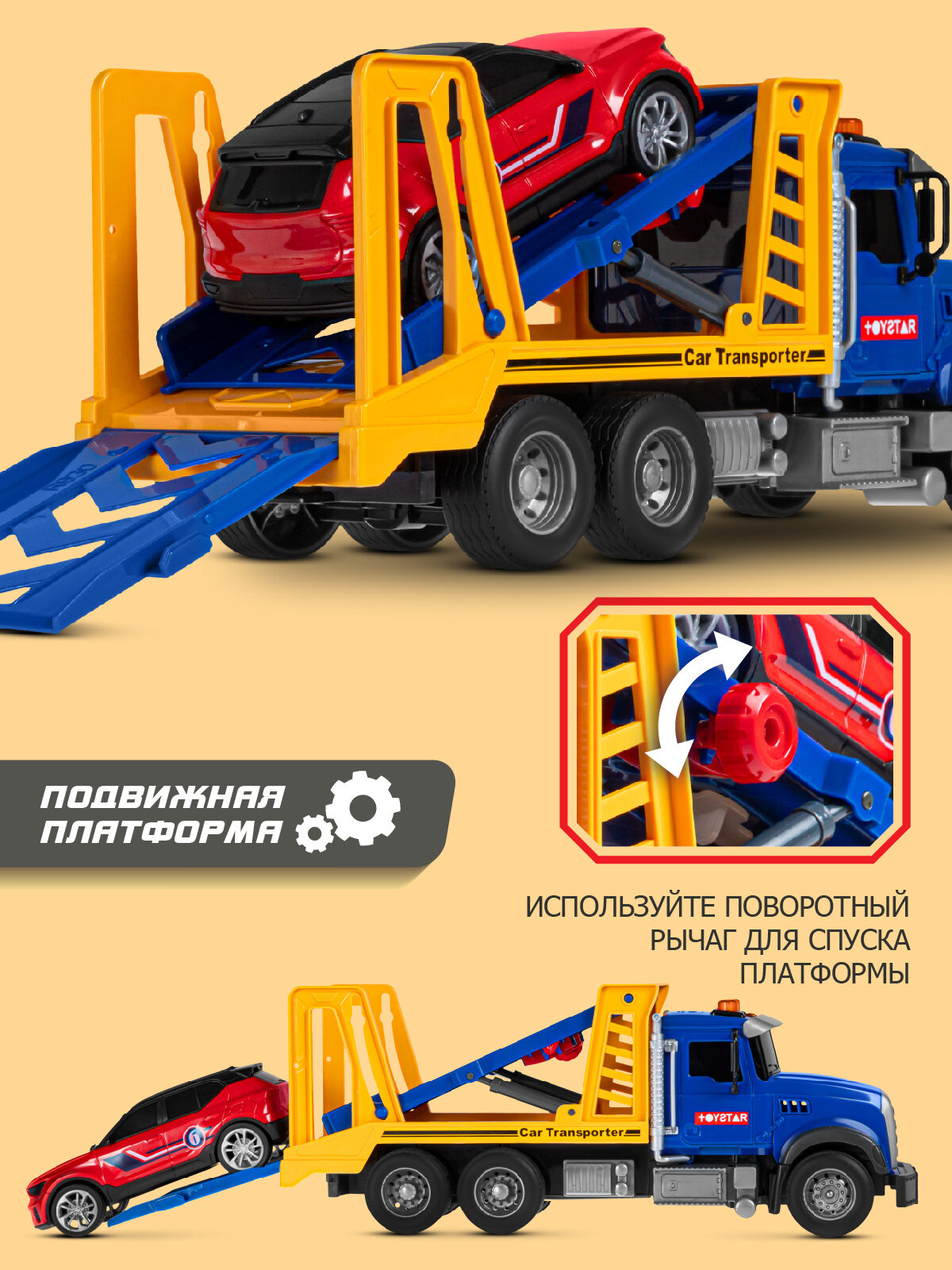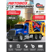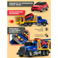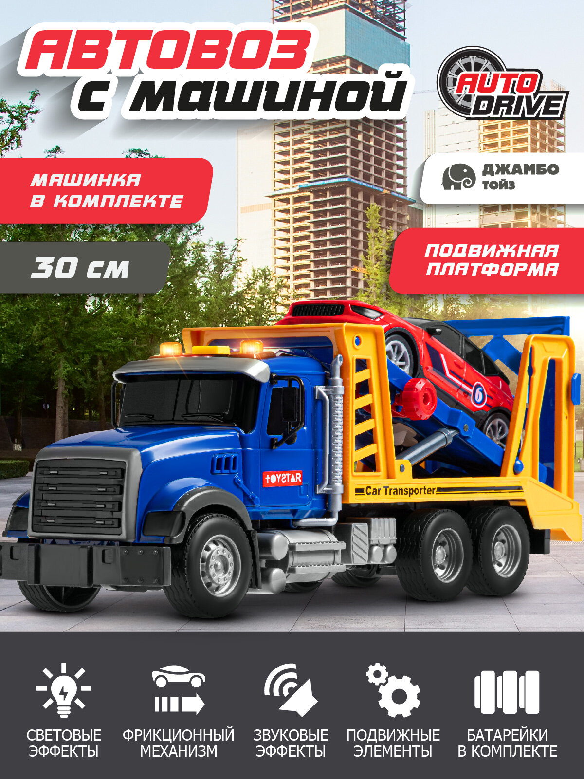 Игрушечный автовоз торговой марки AUTODRIVE станет достойным экземпляром в автопарке вашего ребёнка. Автовоз оснащён фрикционным механизмом, различными подвижными элементами, световыми и звуковыми эффектами. На кабине установлена панель с кнопкой, активирующей реалистичные спецсигналы и подсветку проблесковых маячков. На кузове грузовика-автовоза установлена платформа для перевозки машинки (входит в комплект). Для спуска платформы нужно повернуть рычаг, установленный в боковой части платформы. Автовоз с машинкой порадует не только высокой детализацией, функционалом, подвижными элементами и качественными материалами, но и будет способствовать развитию воображения, логического мышления, мелкой моторики. Игрушечный автовоз станет отличным подарком для юного автолюбителя. Цвет: синий, жёлтый Комплектация: автовоз, машинка Возраст: от 3 лет Размер игрушки: автовоз – 30х14х9,5 см, машинка – 14,2х5,5х6 см Размер упаковки: 34,5х14,5х12 см
