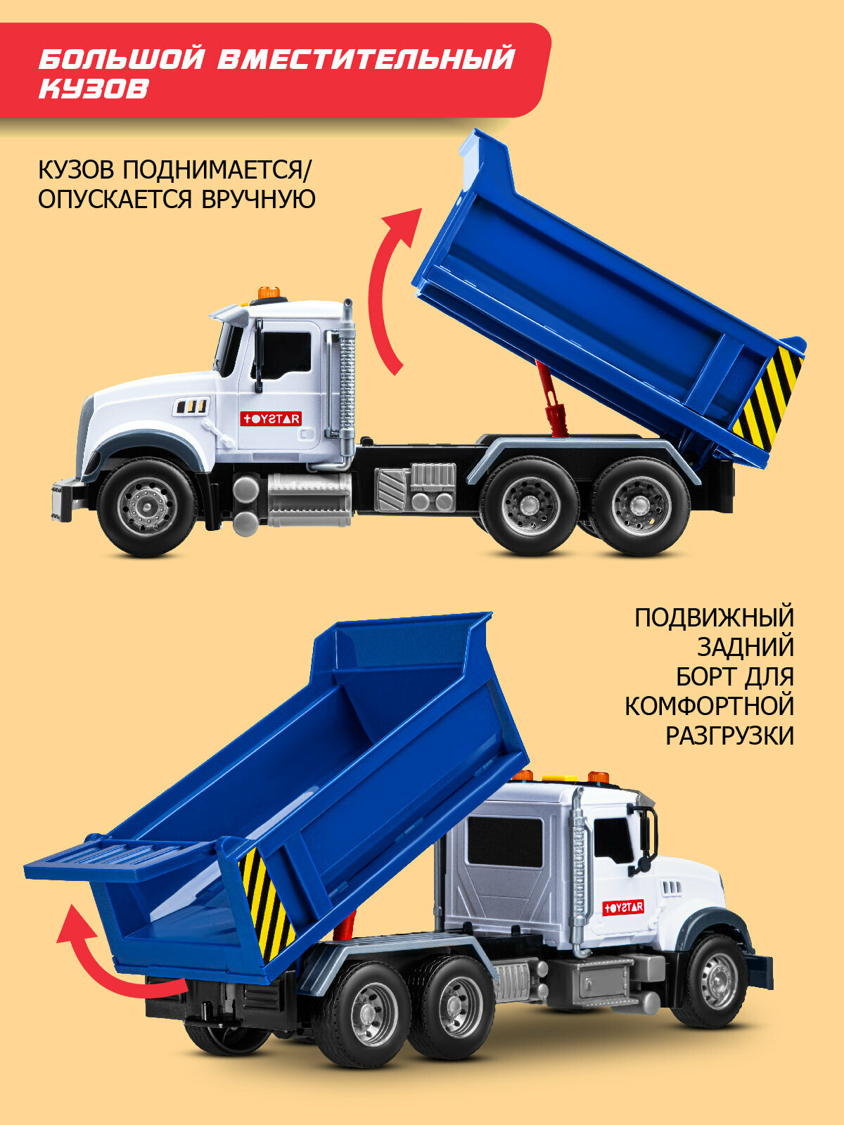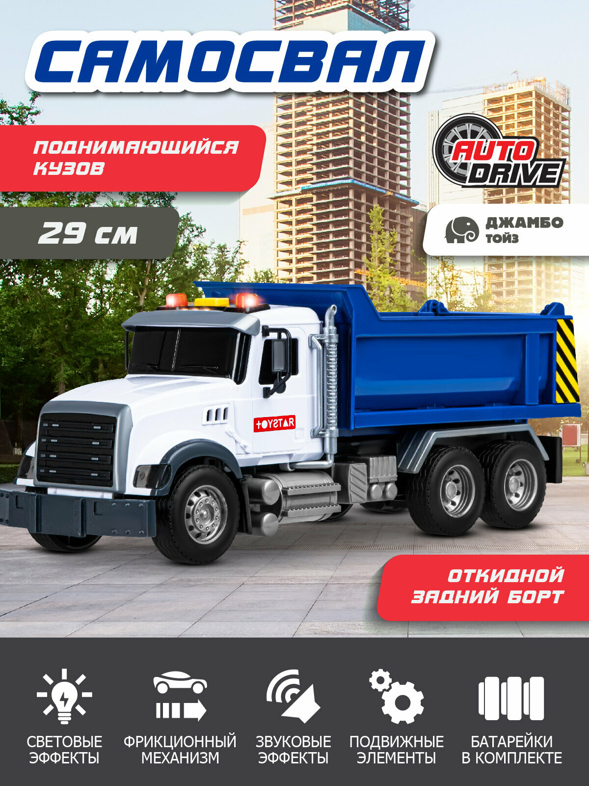 Машина фрикционная Самосвал, кузов поднимается/откидной борт, звук, свет, синий, JB0405092: сравнение цен, характеристики, фото, актуальное наличие и цены.