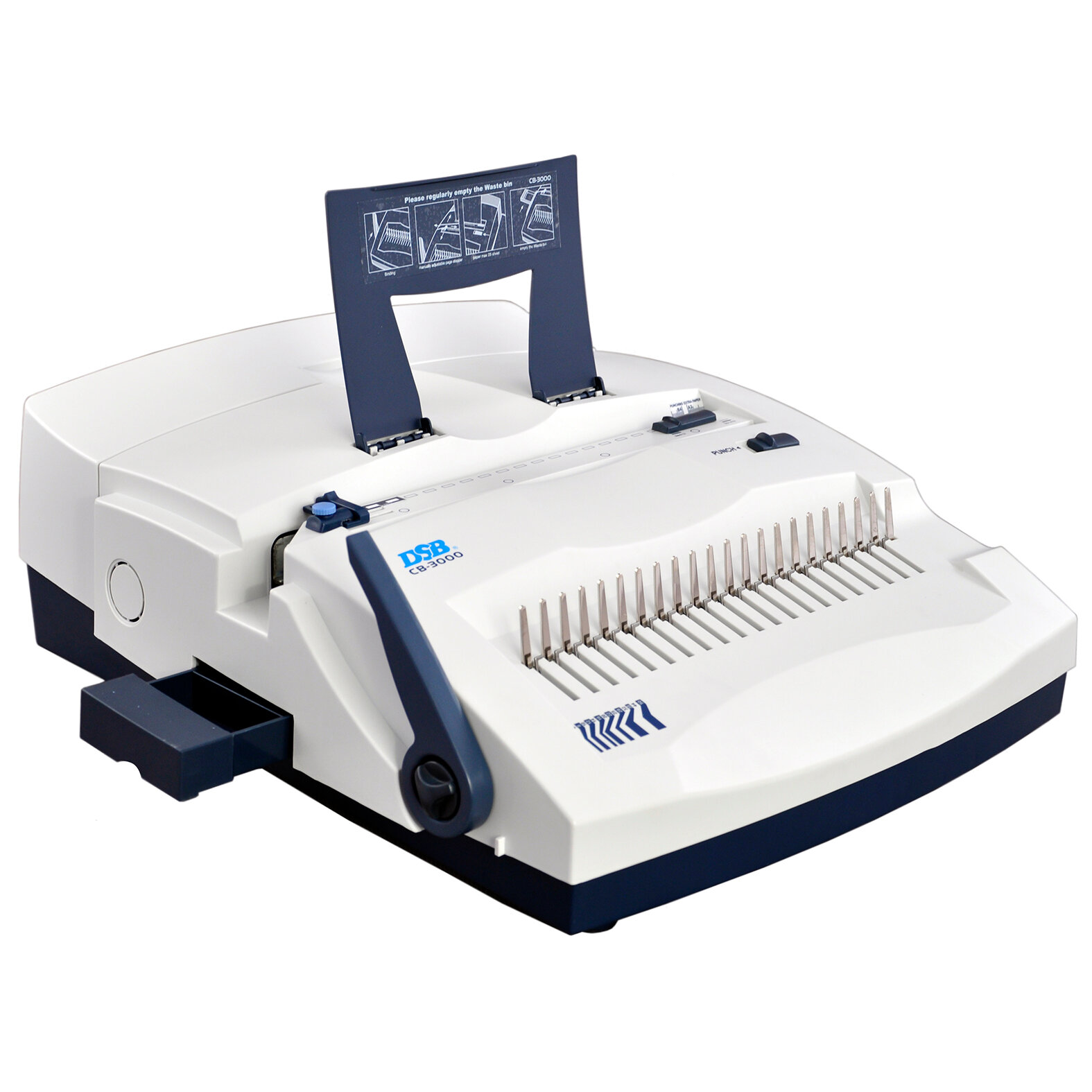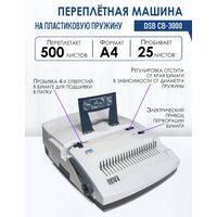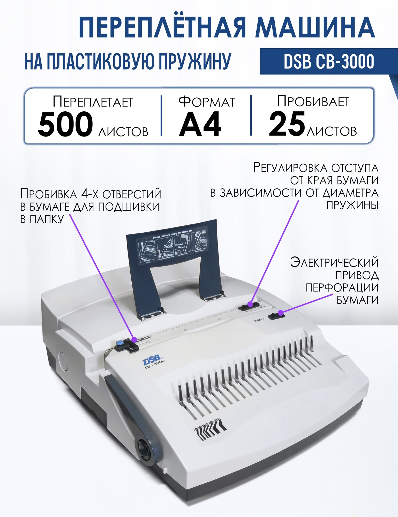 CB-3000 – переплетная машина на пластиковую пружину и дырокол на 4-е отверстия. Мощный брошюровщик с электрическим приводом механизма перфорации бумаги на 25 листов, также пробивающий 4 отверстия в бумаге для подшивки в стандартную папку-скоросшиватель.