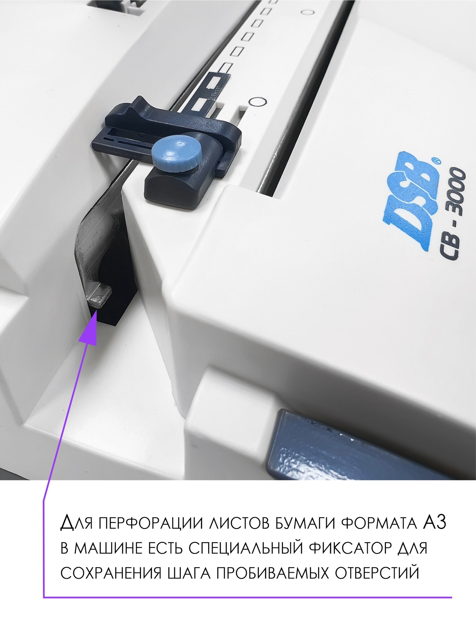 CB-3000 пробивает до 25 листов бумаги и переплетает до 500 листов бумаги на пружину 51 мм. Для перфорации листов бумаги формата А3 в машине есть специальный фиксатор для сохранения шага пробиваемых отверстий.