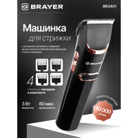 Купить Триммер, машинка для стрижки волос, бороды BRAYER BR3401, LED-дисплей, 4 насадки (3 6, 9, 12мм), 3Вт, база, черный с доставкой по всей России.