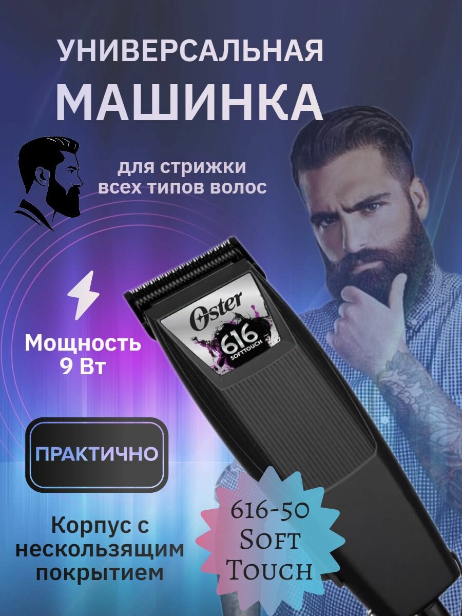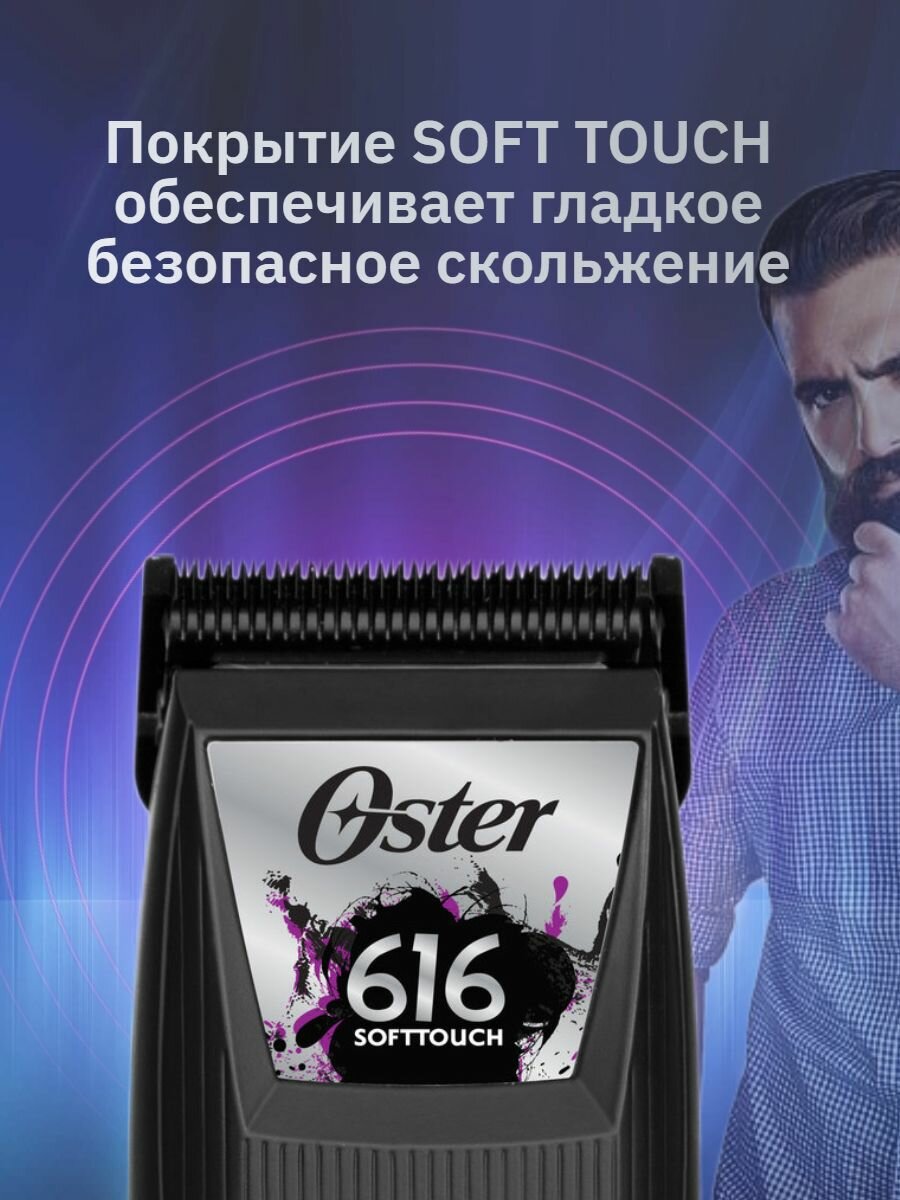 Oster 616-50 Soft Touch - модификация популярнейшей машинки 616 от легендарного американского производителя. Данная модель имеет эргономичное каучуковое покрытие и комплектуется тремя сменными насадками, в остальном она унаследовала все преимущества базовой версии - простоту, исключительную надежность, производительность и высокое качество среза.