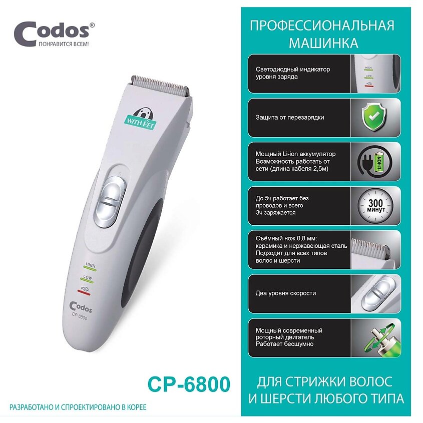 Электрические машинки для стрижки домашних животных Codox CP-6800 - это профессиональный инструмент для ухода за домашними питомцами. Они обеспечивают качественную и аккуратную стрижку, делая процесс ухода за животными быстрым и удобным.